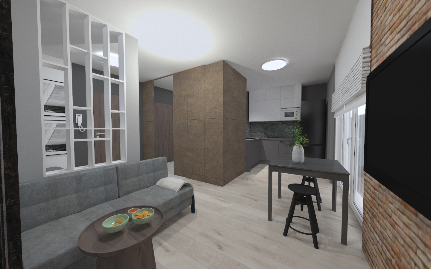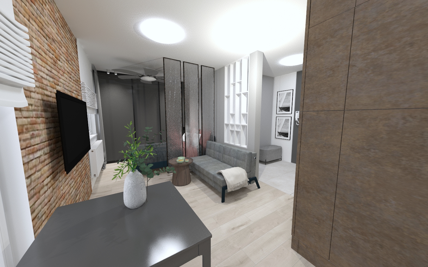 Kawalerka Nova ist ein einzigartiges Studio im industriellen Loft-Stil, das gerade in einem brandneuen Gebäude in der ul. Zębcowska in Ostrów Wielkopolski fertiggestellt wird. Das Apartment besticht durch sein originelles Design: eine Sichtziegel-Akzentwand im Wohnbereich, ein dekorativer Metalllamellen-Raumteiler und ein offener Grundriss, der Wohnbereich und Küche verbindet. Dunkle Graphittöne, heller Holzboden und sorgfältig ausgewählte Dekorationen schaffen das Flair eines modernen urbanen Lofts.